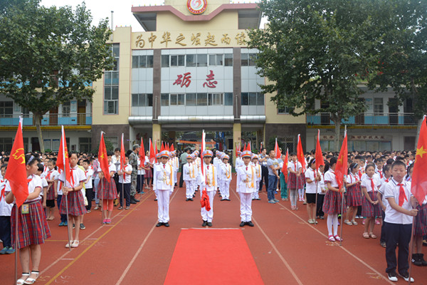 今年是中国人民抗日战争暨世界反法西斯战争胜利七十周年,为进一步增强学生的爱国热情,少先队员代表以“铭记历史 珍爱和平 圆梦中华”为主题作了慷慨激昂的献词,让全体师生铭记日本帝国主义那令人发指的滔天罪行,缅怀在中华民族存亡时刻奔赴抗日前线,抛头颅、洒热血的民族英雄。引导师生明确纪念这场战争,不是为了仇恨,而是着眼于未来。时时提醒自己落后就要挨打,中华当自强!在六年级十二班侯玥同学的带领下,全体师生在国旗、党旗、队旗下进行了庄严的爱国主义宣誓:牢记历史,珍爱和平。勿忘国耻,圆梦中华。牢记历史,珍爱和平。缅怀先烈,开创未来。
